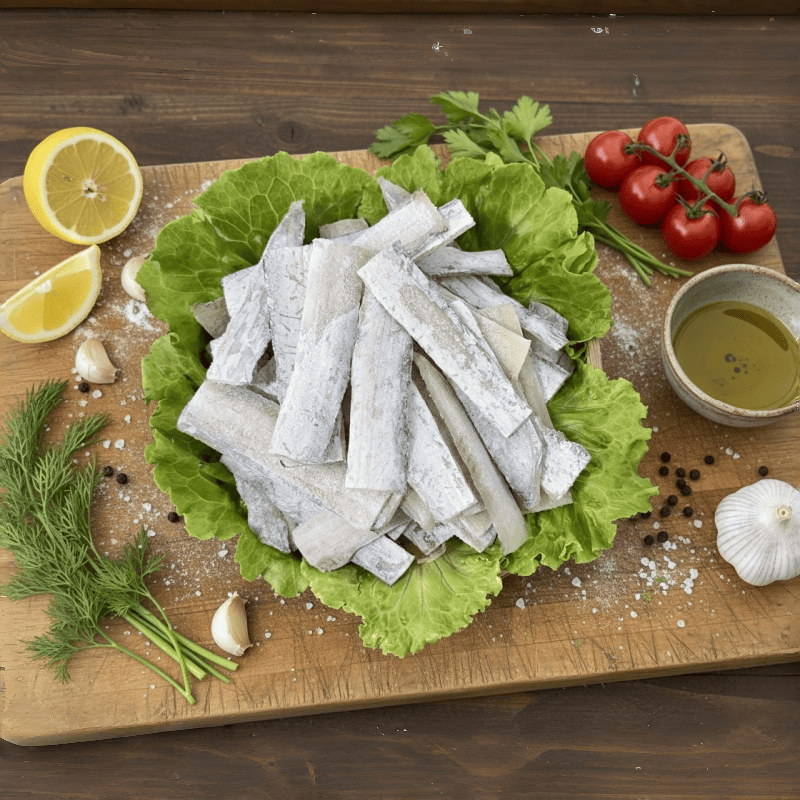 嚴選台灣在地捕撈白帶魚,肉質鮮甜細嫩。經人工去骨去刺處理,切成方便料理的長條狀。